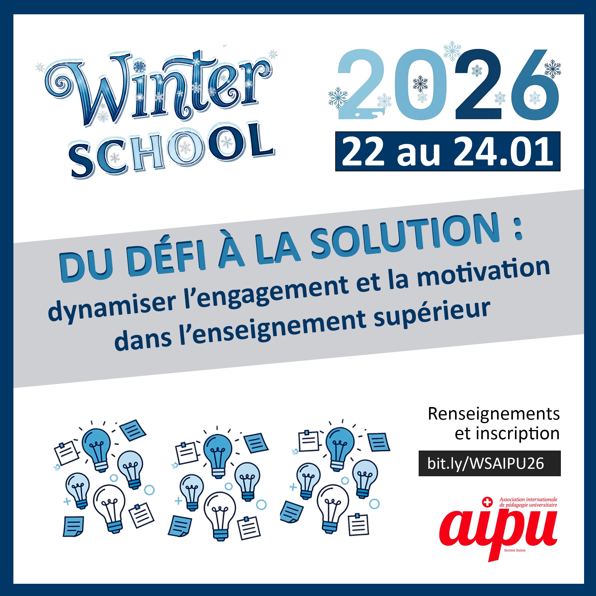La section Suisse organise une Winterschool à Martigny du 22 au 24 janvier 2026 sur le thème "Dynamiser l'engagement et la motivation dans l'enseignement supérieur !". La Winter School 2026 de l’AIPU Suisse s'adresse aux enseignant-es du supérieur et aux conseillers/ères pédagogiques. Pendant deux jours, elle sera consacrée à une question centrale : comment favoriser, nourrir et maintenir l'engagement des étudiant-es dans leur apprentissage, mais aussi celui des enseignant-es dans leurs pratiques pédagogiques ? À travers la méthode du Design Thinking, vous serez invité-es à explorer vos défis concrets : identifier les freins à l'engagement, comprendre les besoins réels de vos publics, imaginer des pistes créatives et tester des solutions applicables dans vos cours ou dispositifs.