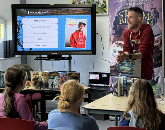 Schrijver in de klas Meer dan 1500 leerlingen van groep 1 t/m 8 verdeeld over 30 scholen in Parkstad hebben de afgelopen weken al een bezoek van een kinderboekenschrijver op school gehad. Door deze ontmoetingen, vaak voorbereid door een leesconsulent van de bibliotheek, raakten leerlingen in de ban van boeken en verhalen. Ze kregen alle kans om vragen te stellen en in gesprek te gaan met onder andere Michael Reefs, Li Lefébure, Kevin Hassing en Rik Peters. Ongetwijfeld hebben deze ontmoetingen bijgedragen aan de motivatie om in een boek te kruipen. Dank aan de Schrijverscentrale en alle betrokken leesconsulenten van de bibliotheken van Heerlen, Landgraaf, Beekdaelen. | |